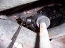 Nun kommen wir zum sch?nsten Teil der Arbeit. Die neue Manschette wieder aufziehen. Die Manschette muss daf?r so weit gedehnt werden, das sie ?ber den Zapfen f?r den Servozylinder geht. Dazu hab ich mit einem gro?em Schraubendreher nachgeholfen. Aber aufpassen, dass die neue Manschette nicht rei?t. Sehr zeitaufw?ndig und krampfhaft f?r die Finger. Auf der rechten Seite und bei Modellen ohne Servolenkung ist das nat?rlich um einiges leichter.