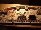 Die Instrumententafel ist nun ausgebaut. Sie besteht aus 3 Ebenen: Dem vorderen Teil bestehend aus dem Klarglas und der Maske, einem mittleren Teil bestehend aus den Zeigermechanismen und einem hinteren Teil, haupts?chlich bestehend aus einem wei?en Tr?ger. Auf ihm sind r?ckseitig die Leiterbahnen und innen eine Platine liegend.