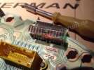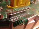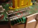 Auf einer Seite der Kontaktleiste ist wieder eine Verriegelung (rot markiert), die aufgehebelt werden muss, bevor die Leiste mit einem Schraubenzieher aus ihrer Halterung gedr?ckt werden kann. Nur so l?sst sich sp?ter die Platine entfernen.