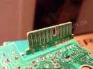 Kommen wir nun zum eigentlichen Problem des Tachoausfalls: Die Makroaufnahme verdeutlicht, dass wahrscheinlich das Absacken der Platine auf Grund mangelhafter Befestigung und den damit auftretenden vertikalen Kr?ften zwischen Platine und den Instrumenten Grund f?r den Ausfall ist. Es bilden sich so Haarrisse an den Stiften der Zeigerinstrumente. Kleine Fehlkonstruktion, das Ganze.