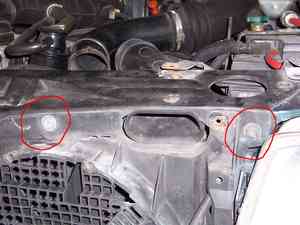 Nun die Halteklammern anhebeln und erstmal die Gummiführung da drunter entfernen. Nun beide Halteklammern gleichzeitig anheben und den Kunstoffträger für die Kühlerlüfter nach vorn hin weg klappen