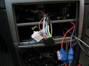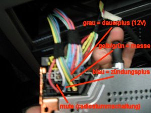 hier seht ihr den spannungsstecker des radios! die kabel sollten mit dem multimeter nachgemessen werden. das radiostummschaltungssignal war hier bei dem radio nicht belegt und mußte ich extra neu anklemmen an das radio. welcher pin die stummschaltung ist, seht ihr auf dem bild!!