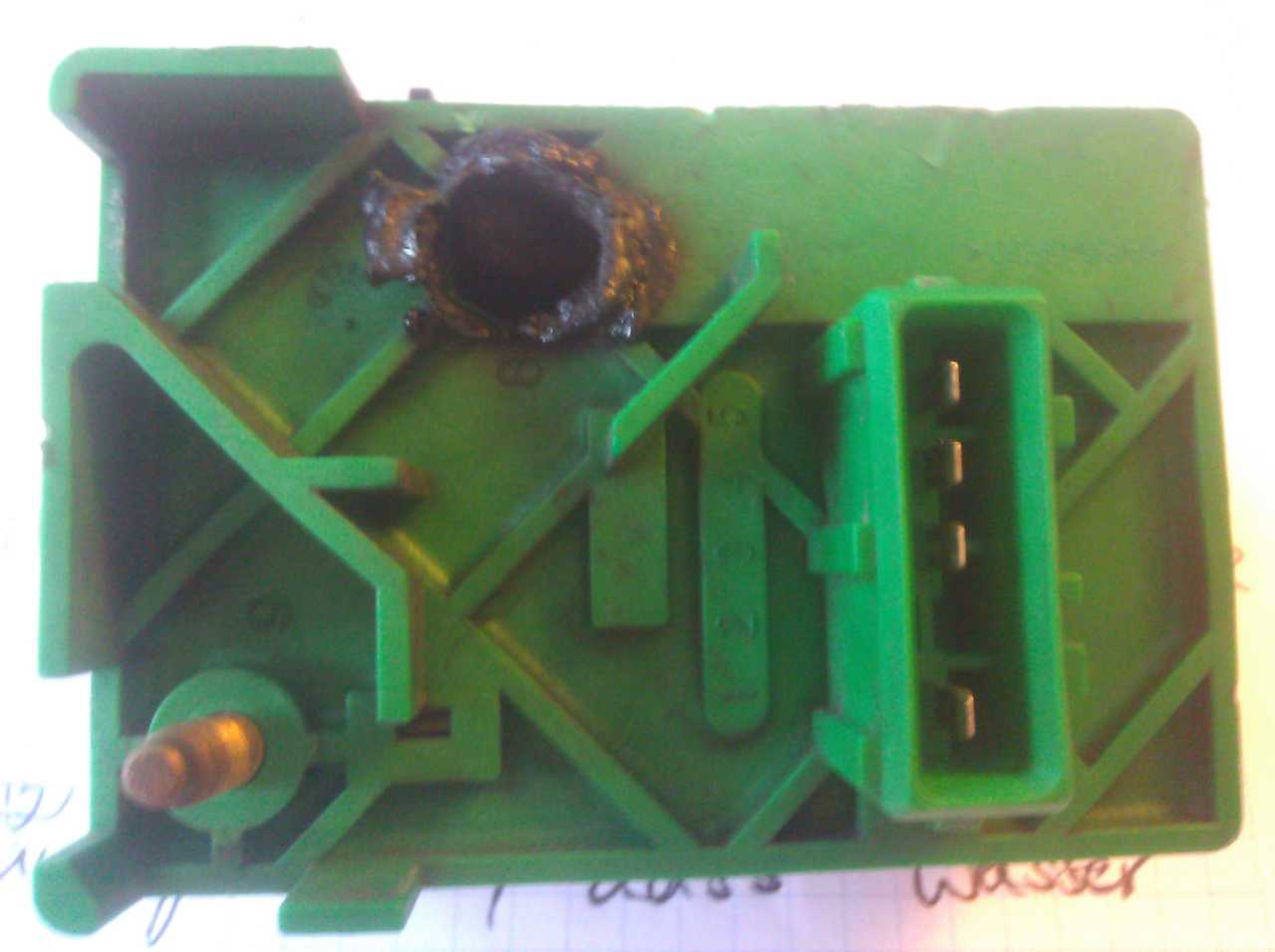 Der Kontakt ist geschmolzen, die flexible Kupferlitze im innern verbrannt. Auf der innenliegenden Steuerplatine sind 2 Leiterbahnen durchgebrannt.