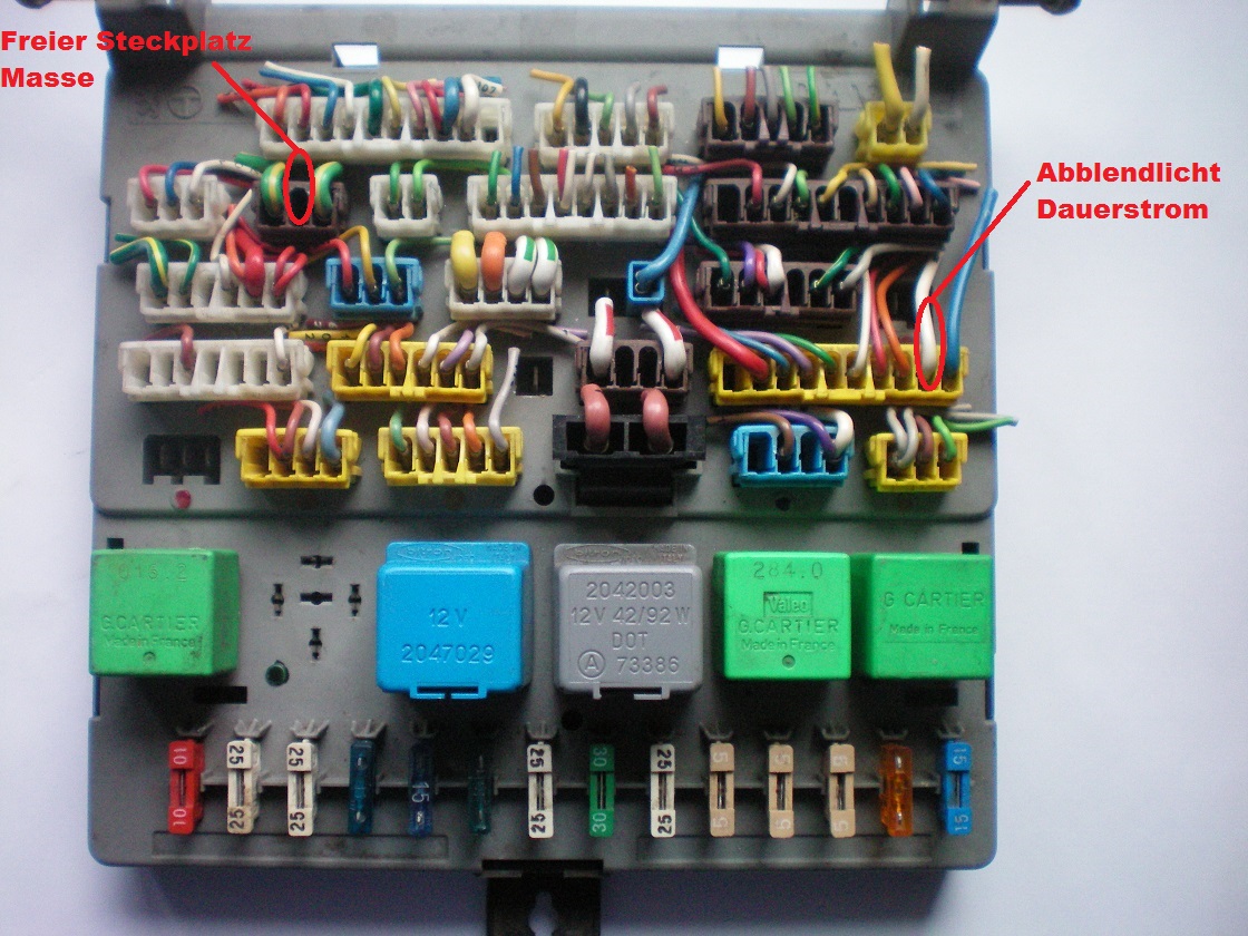 Die gelben Leitungen (Dauerstrom bei Abblendlicht an) ziehst du in den Innenraum und verbindest sie mit der Lila (Dauerstrom bei Abblendlicht an) und verbindest alles mit dem dicken Weisen Kabel (R) im 10-poligen gelben Stecker im Sicherungskasten.