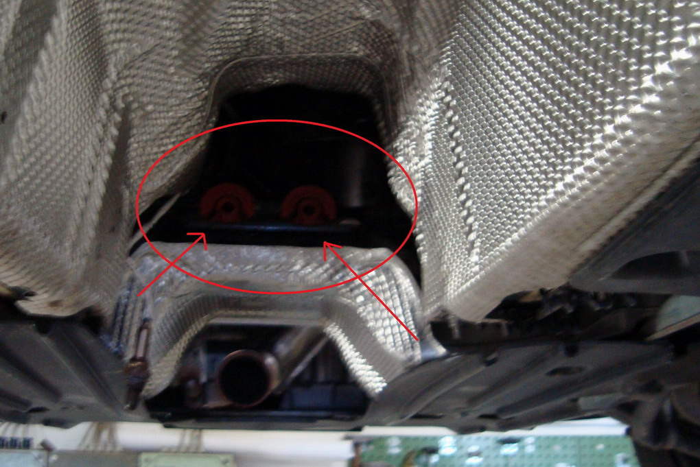 hier sehen wir das Auto von unten mit bereits demontiertem Auspuff. Die beiden roten Eingänge sind die Löcher wo die vermuteten Messleitungen reingehen.