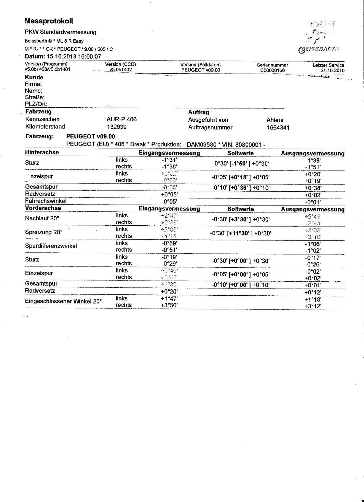 Soll: 0°13' ... 0°22' (Oder nach Protokoll von 406D 0°18' +/- 0°05') --> fast gleiche Sollwerte