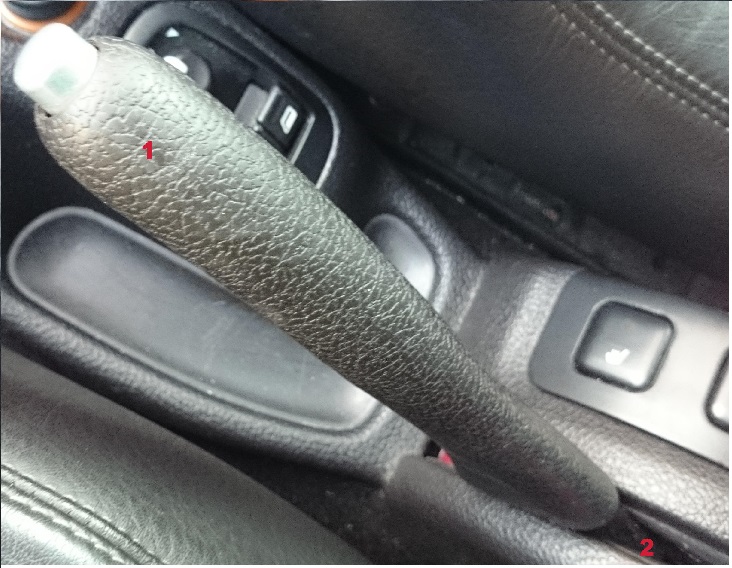 2) Handbremsgriff: Dieser Gummiüberzug (Nr.1 auf Foto) soll nur abgezogen werden können, und dann der universale Griff drauf, Schrauben anziehen Leder umstülpen und fertig. Als Tipp wird jeweils angegeben, dass die Ledermanschette in dieses Kästchen gestopft werden soll (Nr.2 auf Foto). Der Spalt dieses Kästchens ist aber so schon sehr schmal, wenn ich jetz das Leder noch reinstopfe, gibts dann nicht eine Verengung, sodass es nichtmehr einwandfrei rauf und runter rutscht?