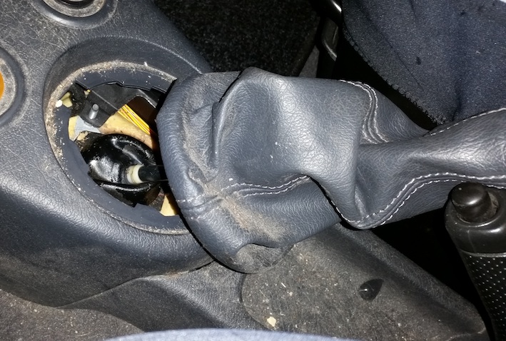 Vorhin habe ich etwas zu energisch den Rückwärtsgang eingelegt und war dann zunächst verwundert, dass ich die Handbremse nicht so einfach wie sonst lösen kann, weil der Schalthebel den Handbremshebel blockiert...