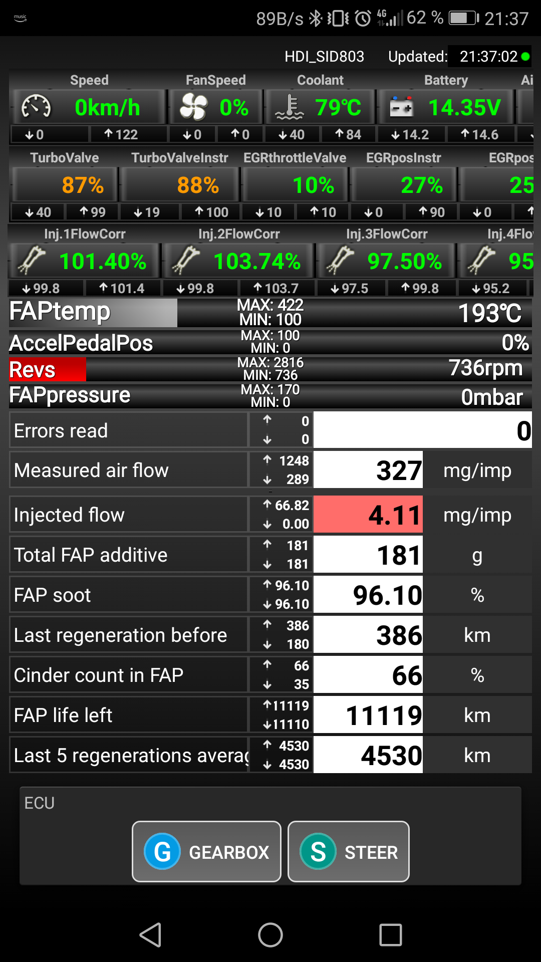 Kennt sich jemand mit diesem Thema aus? Nachdem mein Dieselrußpartikelfilter bei meinem 508 Blue HDI 150 nach 102TKM gereinigt werden musste wollte ich mir mal ein genaueres Bild von der Regeneration machen. Da ich überwiegend Kurzstrecken fahre was nicht optimal ist. Ich habe mir die Torque Pro App gekauft und einen OBDII Adapter. Die App funktioniert ganz gut aber leider fehlen mir einige interessante DPF Werte die man durch sogenannte PIDs abfragen kann. Hat jemand vielleicht diese Peugeot spezifischen PIDs zur Abfrage des DPF Status. Ich kann bis jetzt die DPF Temperatur und den Differenzdruck auslesen. Schön wäre noch die Russbeladung zu wissen.