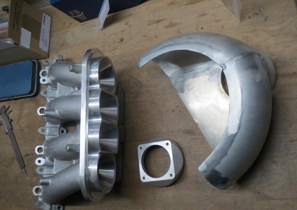 Endlich geht es weiter. Das Getriebe wird in dieser Woche noch fertig und die Cerametall Kupplung soll in rund vier Wochen ankommen. Auch die Ansaugbrücke werde ich in dieser Woche vermutlich fertig bekommen. Anbei ein Bild vom derzeitigen Stand. Es müssen nur noch alle Kanten entfernt werden, die Drosselklappenaufnahme, Unterdruckanschlüsse und Sensorenaufnahmen angeschweißt werden und das fertige Plenum an die Trichterplatte geschweißt. Dann kann die neue, rund 1 - 1,5 m kürzere Ladeluftverrohrung gebaut werden.