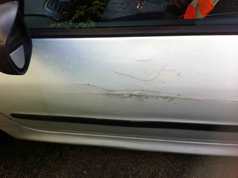 - Die Fahrertüre besteht großteils aus Spachtelmasse, über der die Lackierung aufgebrochen ist (siehe Bild)