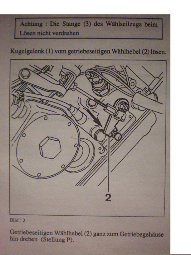 Der Wählhebel muß auf P stehen und wenn du den neuen Zug einbaust mußt du den Getriebeseitigen Wählhebel ganz zum Getriebegehäuse hindrehen das ist die P Stellung.