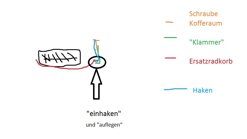 das müsste der Fanghaken(Klammer) sein: der Haken mit dem Ersatzradkorb muss so weit runtergelassen werden, dass er auf dem Fanghaken(Klammer) dann aufliegt..quasi so: