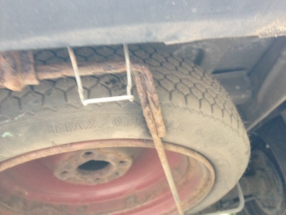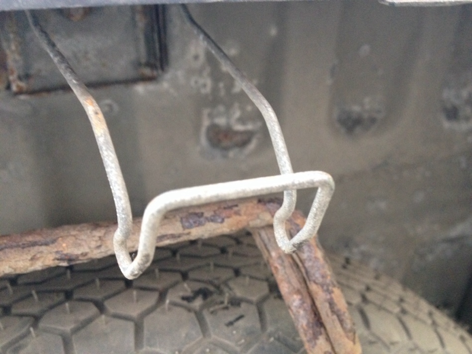 das müsste der Fanghaken(Klammer) sein: der Haken mit dem Ersatzradkorb muss so weit runtergelassen werden, dass er auf dem Fanghaken(Klammer) dann aufliegt..quasi so: