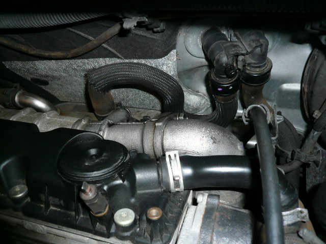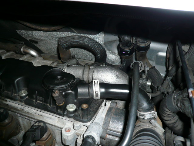 Nun zeigt sich aber eine Undichtigkeit und zwar am Flansch des Ansaugrohres , welches ja vom Turbo kommend , oben eine 45 Grad Biegung macht und dann am Sammler angeflanscht ist . Dazwischen sitzt eine sehr dünne Dichtung und die läßt jetzt zunehmend mehr Öl und Druck vom Turbo raus .